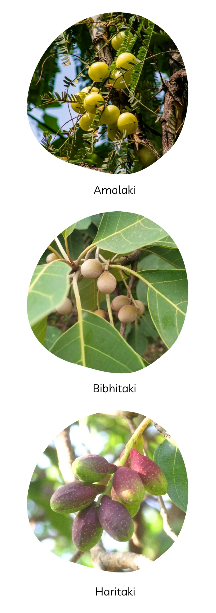 Triphala jest jedną z najbardziej znanych receptur ajurwedyjskich. Słowo to oznacza dosłownie “trzy owoce” i wskazuje na to, co tworzy tę mieszankę. W równych proporcjach składa się z Amli (Emblica Officinalis), Haritaki (Terminalia Chebula), Bibhitaki (Terminalia Bellirica). W medycynie ajurwedyjskiej uznaje się, że jej lecznicze działanie wynika z faktu, iż posiada aż pięć z sześciu smaków (oprócz słonego).