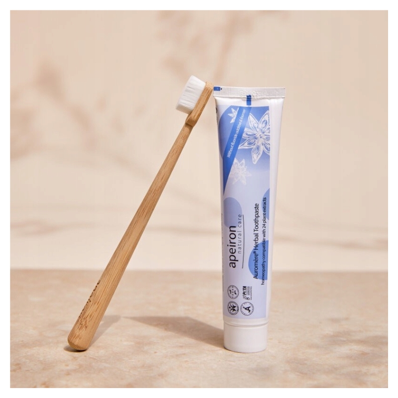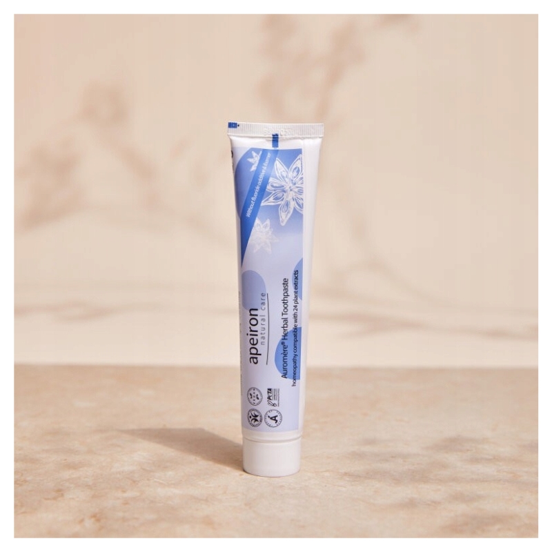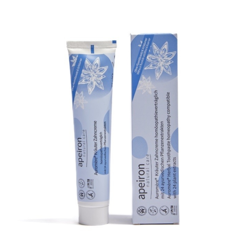 Apeiron Auromère® pasta do zębów z 24 ziół ajurwedyjskich 75 ml łączy w sobie ekstrakty roślinne z łagodnymi substancjami ścierającymi pochodzącymi z naturalnych minerałów. W delikatny sposób usuwa płytkę nazębną i odświeża oddech.