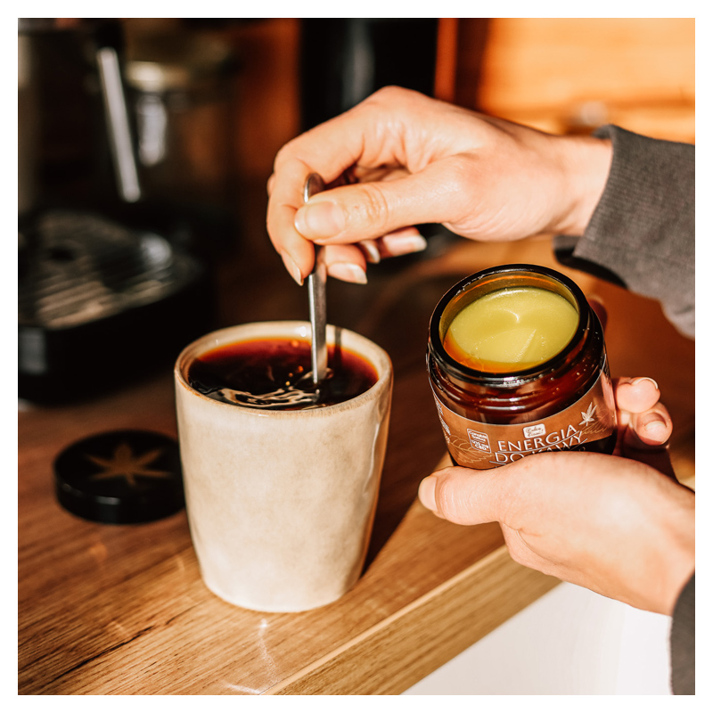 Energia do kawy konopna z CBD to kompozycja na bazie tradycyjnie wytwarzanego masła sklarowanego ghee, macerowanego z suszem konopnym (Cannabis sativa) pochodzącym z polskich, certyfikowanych upraw. Produkt łączy kremową konsystencję ghee z delikatnym, ziołowym aromatem konopi.