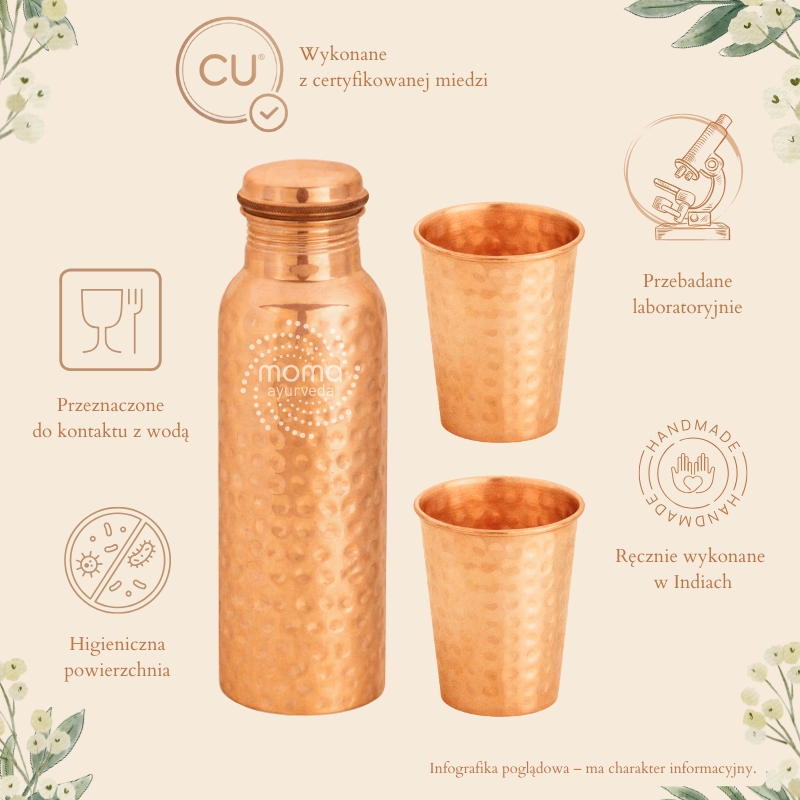 ✅ Według tradycji ajurwedyjskiej picie wody z miedzianych naczyń pozwala utrzymać balans pomiędzy wszystkimi doszami: vatą, pittą, i kaphą.